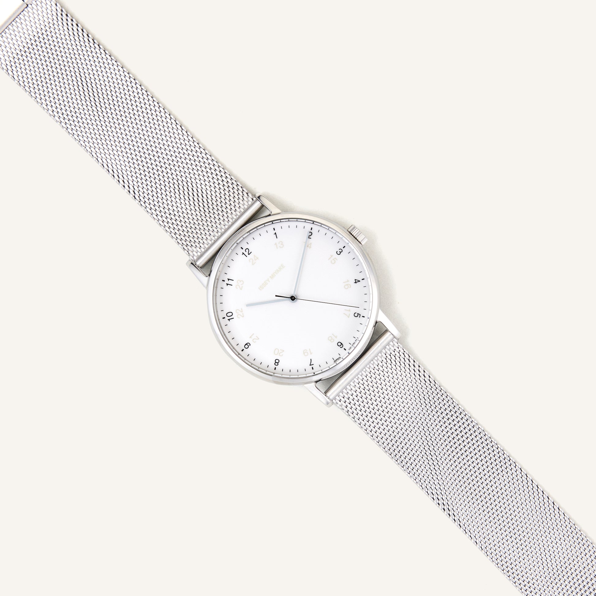 The “morning” dial is finished in fresh white with numbers 1 to 12 clearly outlined.