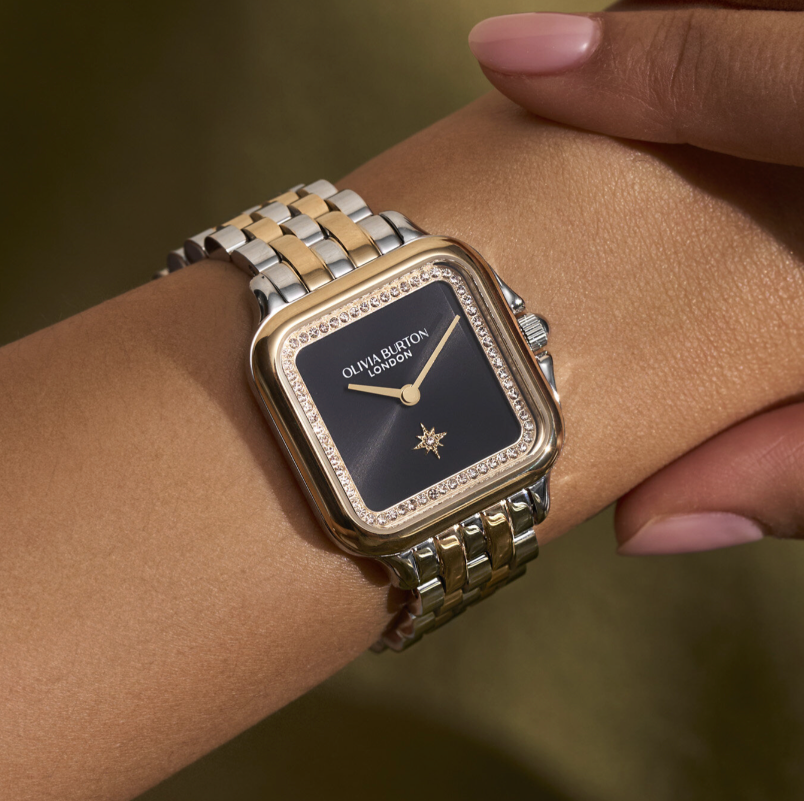 The iconic Grosvenor watch gets a little extra drama. A black sunray dial is framed by tonal light gold crystals to showcase the elegant soft-square design. Finished with a meaningful North Star marker and two-tone bracelet strap, this dial is a celebration of London’s sophisticated style.