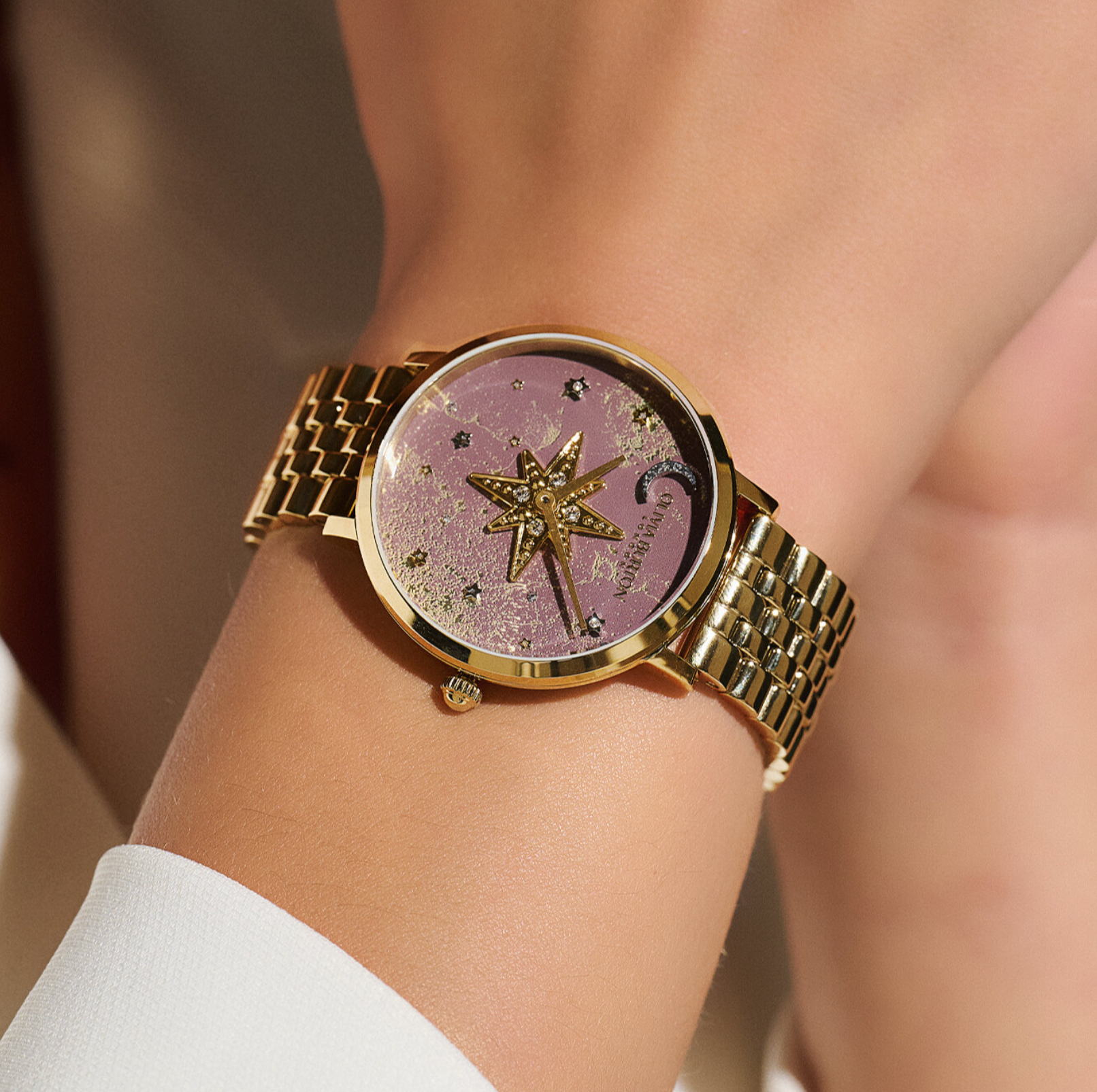Gaze into the night sky with the Celestial Nova watch; the latest addition to our Signature collection. Inspired by clear evenings, the smooth, sculpted mushroom dial is sprinkled with stardust and finished with miniature moon and multi-dimensional North Star. Feel the luxury with a gold-plated link bracelet strap for a cool, contemporary feel. A little guiding light for your wrist.