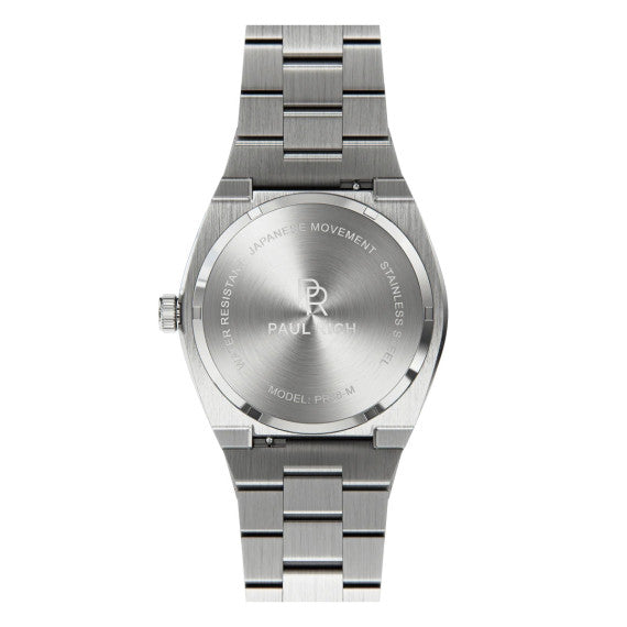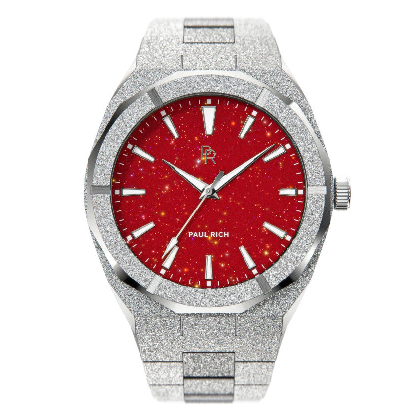 The Paul Rich Watch Frosted Star Dust - Red Silver features a deep red dial, wrapped in stainless steel with a frosted finish that shines like diamond dust. This isn’t just a watch—it’s art on your wrist.