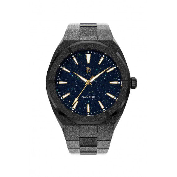The Paul Rich Watch Frosted Star Dust - Black features a black sunray dial wrapped in stainless steel with a frosted black finish that shines like diamond dust. This men's watch is timeless—bold & unforgettable.