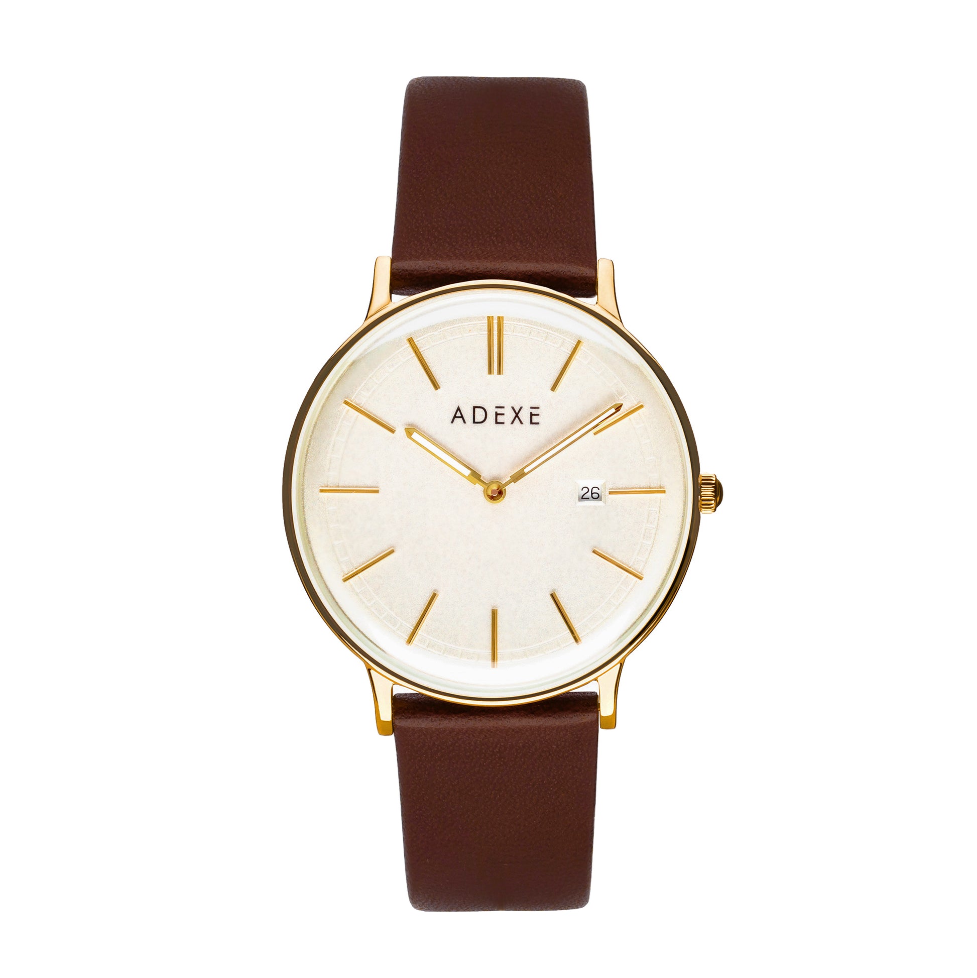 The ADEXE Meek Grande Gold & Brown is a chic women's watch that blends luxury and style. Featuring a gold stainless steel case and a rich brown leather strap, it's perfect for any occasion. With water resistance up to 30 meters and a lightweight design, this watch adds elegance to your look effortlessly. Elevate your style with the ADEXE Meek Grande!