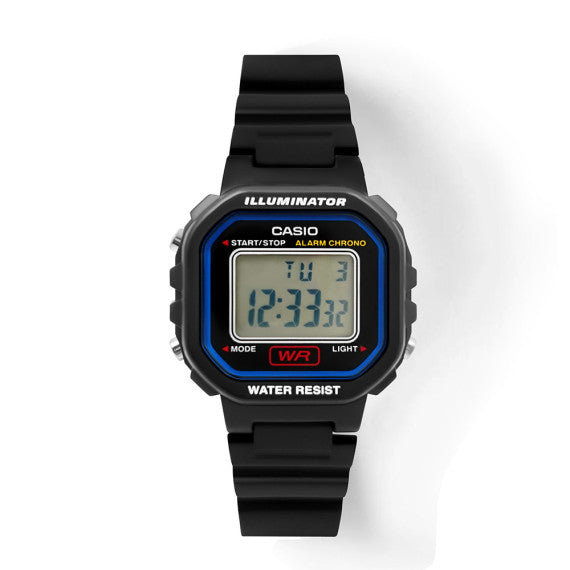 The CASIO Classic LA-20WH-1C in Black & Blue is a stylish and functional timepiece that stands out with its bold color combination. The black case is complemented by vibrant blue accents, giving it a sporty yet classic look.