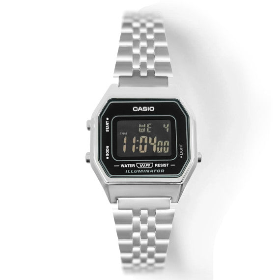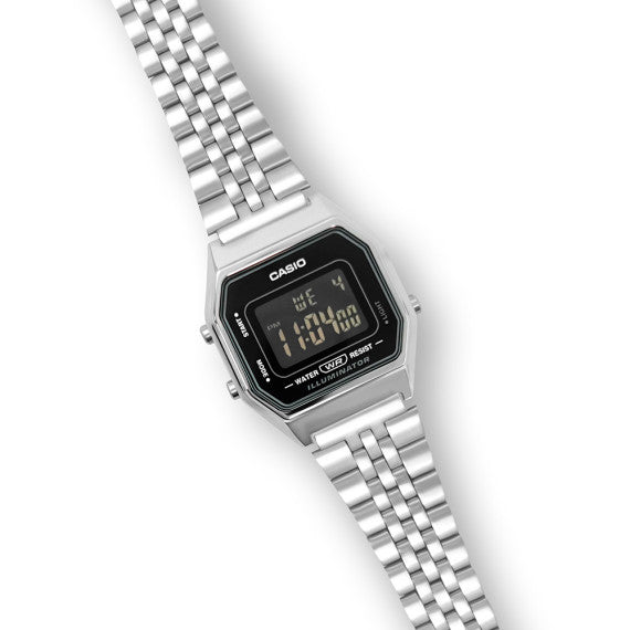 The CASIO Vintage LA680WA-1B in Black and Silver is a stylish digital watch that combines retro charm with modern functionality. Featuring a sleek black dial and polished silver stainless steel band, it offers essential functions like a stopwatch, alarm, and calendar. Lightweight and comfortable, this watch is perfect for any occasion, making it a versatile accessory for those who appreciate classic design.