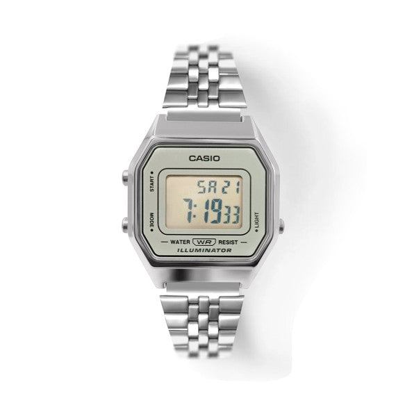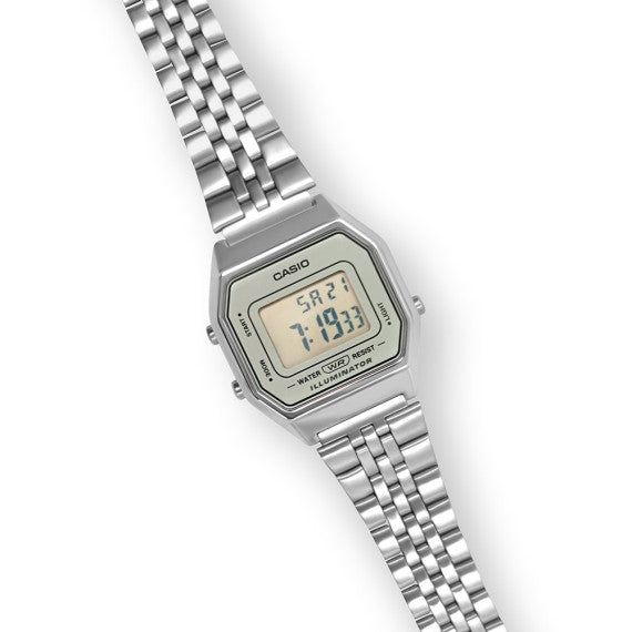 The CASIO Vintage LA680WA-7 in Silver is a timeless digital watch that exudes classic elegance. With its sleek silver case and minimalist design, this watch effortlessly complements any outfit. It features essential functions, including a stopwatch, alarm, and calendar, making it practical for daily use.