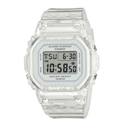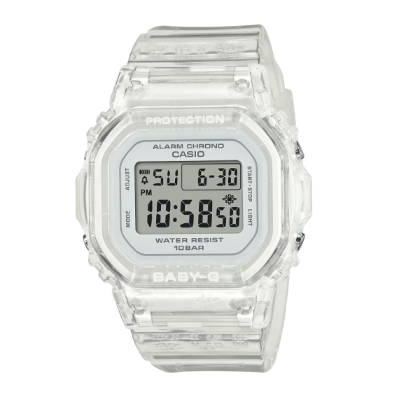 The CASIO Baby-G Digital BGD-565US-7 in Transparent is a striking and contemporary timepiece that embraces a unique see-through design. This watch offers a playful yet sophisticated look, making it a standout accessory for any outfit.