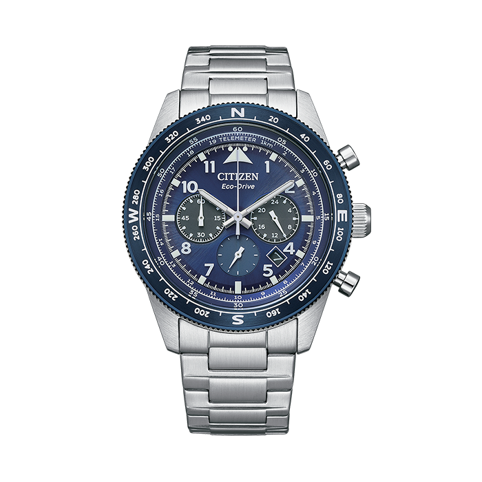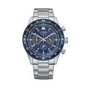 The Citizen CA4554-84L is a 43mm Eco-Drive stainless steel watch, offering 10-bar water resistance and superior durability. Its sleek blue dial and chronograph function make it both stylish and functional.