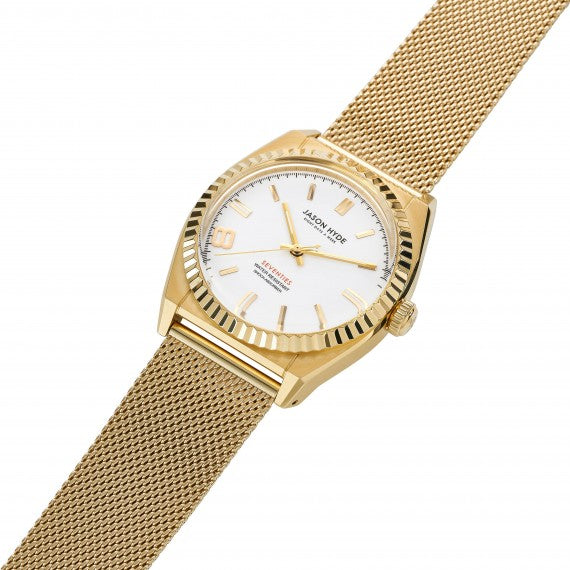 The Jason Hyde Eight Gold is a luxurious gold-tone watch, featuring a stainless steel case, gold dial, and mesh strap. Designed with a quartz movement, this timepiece is a perfect blend of simplicity and sophistication.