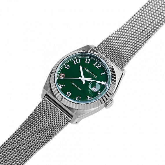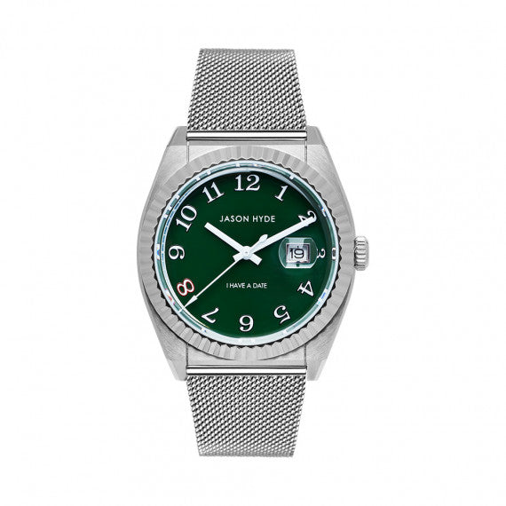 The Jason Hyde I Have A Date Silver/Green blends sleek silver tones with refreshing green accents. Featuring a stainless steel case, date function, and quartz movement, this watch offers modern elegance with a unique color combination.
