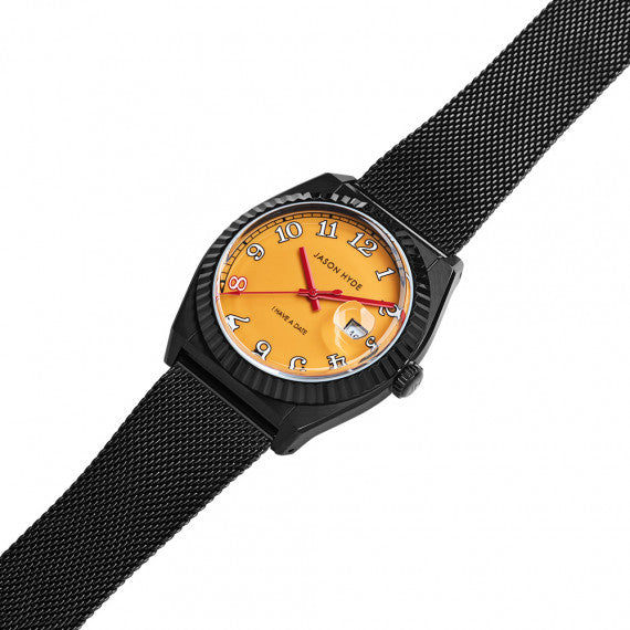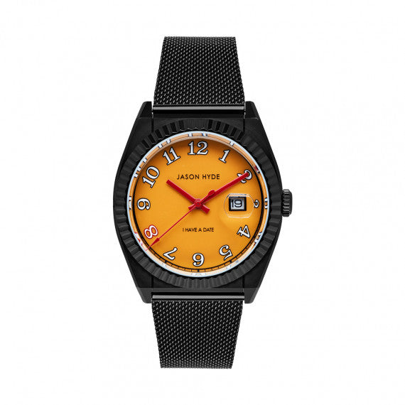 The Jason Hyde I Have A Date Black/Orange is a modern and bold timepiece, featuring a sleek black case, vibrant orange dial accents, and a stainless steel mesh strap. With a quartz movement and date function, this watch is both stylish and functional.