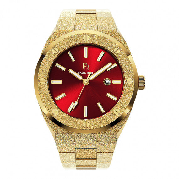 The Paul Rich Watch Frosted Signature - Sultan's Ruby features a red sunray dial wrapped in stainless steel with a frosted gold finish that shines like diamond dust. This men's watch is timeless—bold & unforgettable.