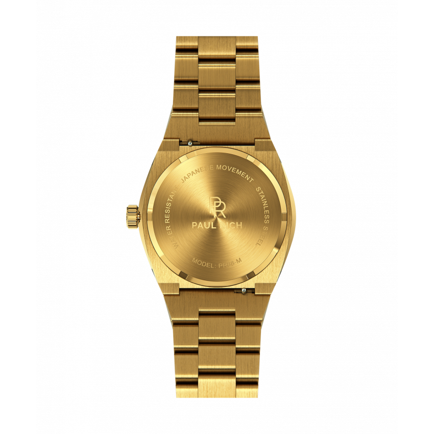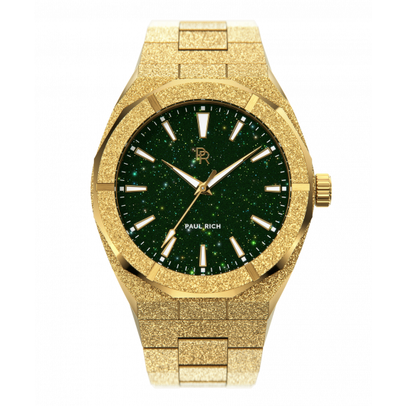 The Paul Rich Watch Frosted Star Dust - Green Gold features an aventurine dial wrapped in stainless steel with a frosted gold finish that shines like diamond dust. This men's watch is timeless—bold & unforgettable.