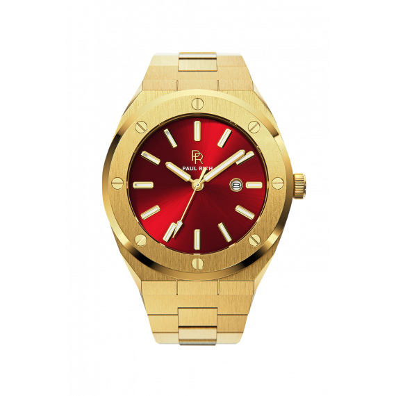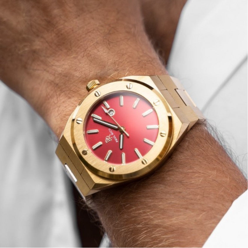 Introducing the Paul Rich Watch Signature - Sultan's Ruby, a stunning fusion of style and durability. This timepiece features a striking red sunray dial, accentuated by a 316L stainless steel case and strap, making it perfect for both casual and formal occasions.