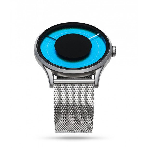 The ZIIIRO SOLARIS Chrome - Chill is a sleek and modern wristwatch, featuring a polished chrome stainless steel case and a tranquil blue gradient dial. Inspired by the serene colors of a clear sky, this watch blends minimalism with artistic design. With a futuristic dial display and precise quartz movement, this timepiece is perfect for those who embrace sophisticated simplicity.