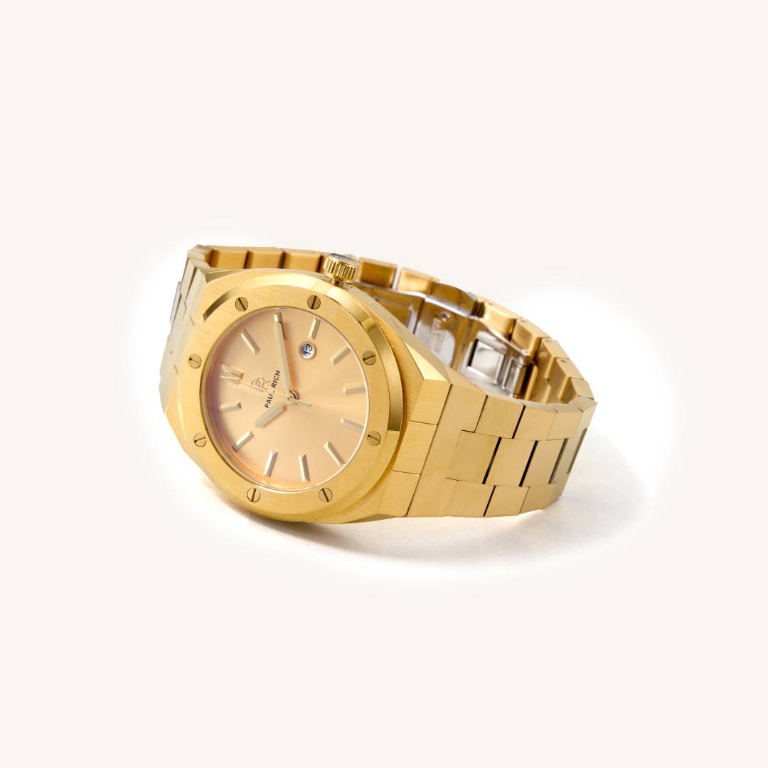 Introducing the Paul Rich Watch Signature - Midas Touch, a stunning fusion of style and durability. This timepiece features a striking gold sunray dial, accentuated by a 316L stainless steel case and strap, making it perfect for both casual and formal occasions.